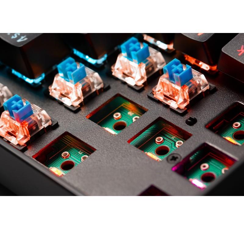 Klawiatura wykorzystuje przełączniki mechaniczne OUTEMU Blue, cenione za wyczuwalny moment aktywacji i klikający charakter pracy. To dobry wybór dla osób, które lubią klasyczne odczucia z klawiatur mechanicznych i oczekują szybkiej reakcji w trakcie gry.